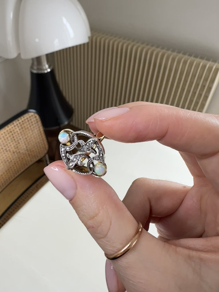 コンディション:ゴールドとシルバーの部分にわずかな微細な傷と酸化、ダイヤモンドとオパールにわずかな擦り傷、ダイヤモンドにいくつかの凹凸あり。
