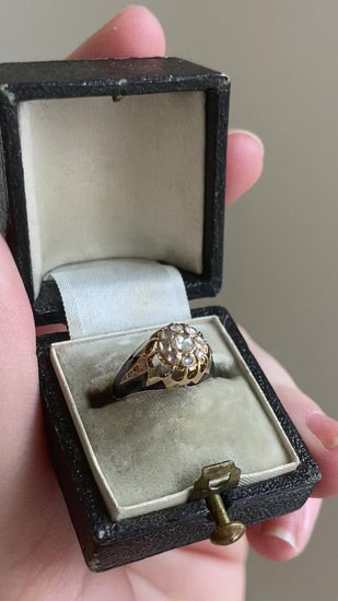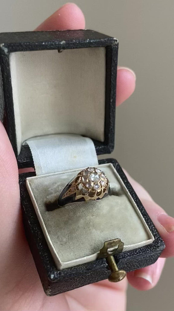 アンティークの子供用リング、9金(トレフォイル・ホールマーク)とダークブルーのエナメル、ローズカット・ダイヤモンドの周囲にローズカット・ダイヤモンドをセット