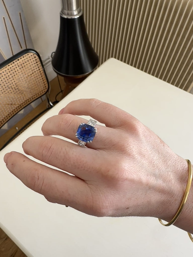 18Kホワイトゴールド製(ホールマーク:イーグルヘッド)、センターに7.94カラットの美しい濃紺のクッションカットのセイロン産サファイアをセットした極上のリング。