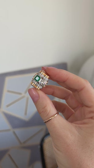 18Kローズゴールドとプラチナのタンクリング(ホールマーク:hibou and Mascaron)。センターにスクエアカットのエメラルド(約0.60ct)とオールドカットのダイヤモンド(約0.70ct)(カラーは推定I、クラリティは推定VS)。