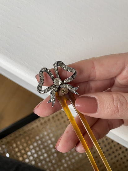 アンティークカットのラインストーン(またはラインストーン)で装飾された結び目の形のエレメントを、箔にマウントしたホーンヘアマノンです。