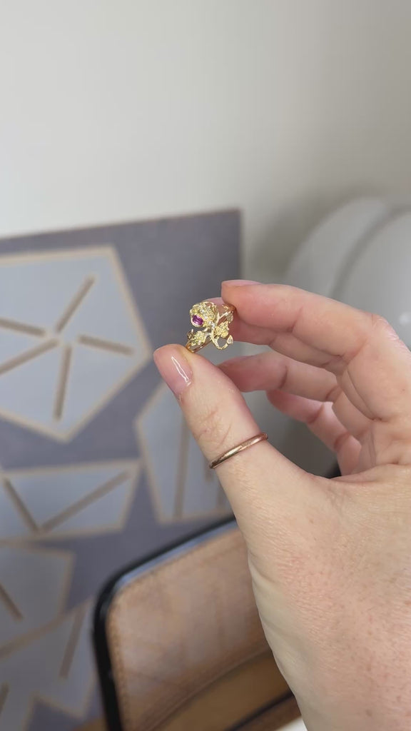 18金イエローゴールド製(刻印:フクロウ)のバラ型リング。約0.10カラットのオーバルカットルビーと、ローズカットダイヤモンドをあしらっています。