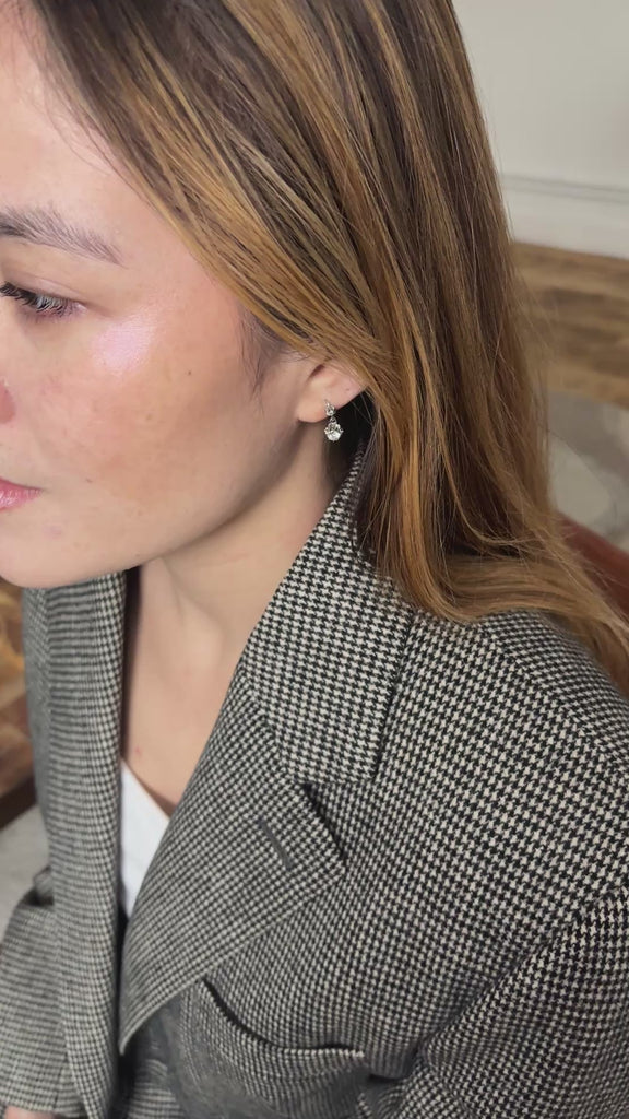 プラチナ製スリーピングイヤリング (刻印:犬)、2つのハーフカットダイヤモンド(総重量約0.65カラット、推定カラーH、推定純度VS2およびSI1)が、関節式のエンボス加工されたチャトンにセットされ、その上に2つの8x8カットダイヤモンド(総重量約0.05カラット)が配されています。