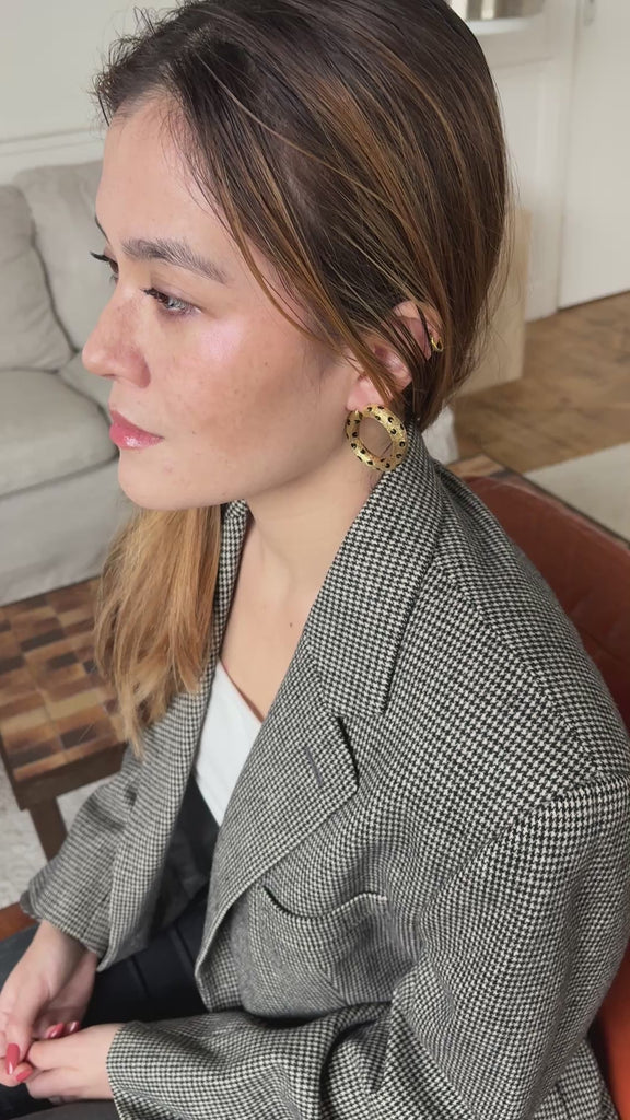 ペアのイヤリング、フープタイプ、18Kイエローゴールド(刻印:鷲の頭)フレッド社の「パンサーの足」コレクションより。ゴールドにはテクスチャーが施され、黒のエナメルが散りばめられており、パンサーの毛皮を模しています。