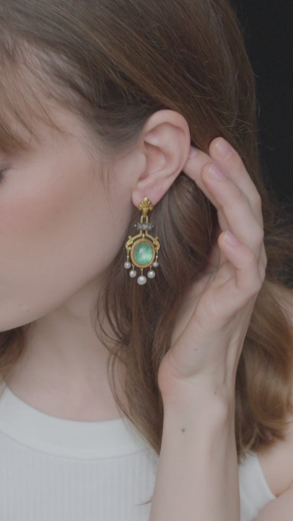 18Kイエローゴールドとシルバーのペアイヤリング(ホールマーク:イーグルヘッド)。 合計約5.00カラットのエメラルドカボション、ローズカットダイヤモンド、ファインパールをセット。 クロージングシステム:スワンネック。
