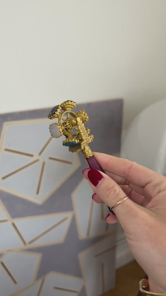 6つのインタリオ(下記説明参照)とガラス・ペーストのハンドルから成る、珍しい繊細な金メッキのキャッシェ・ホイール。