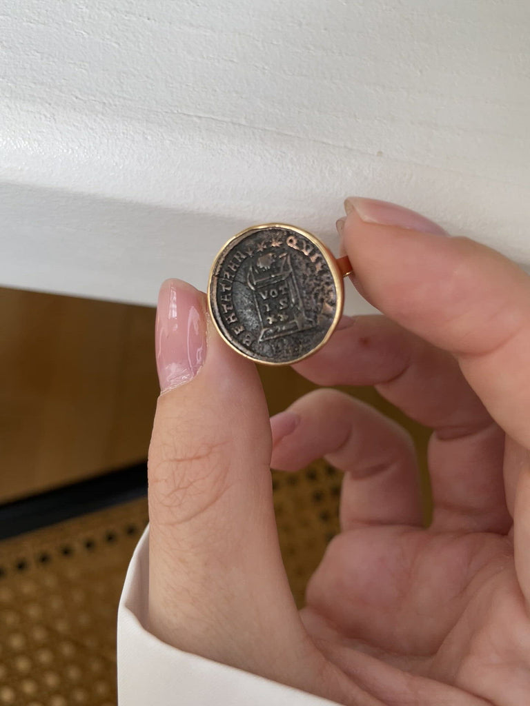 18Kローズゴールドのリング(ホールマーク:フクロウ)に、アンティークのローマ銅貨をセット。