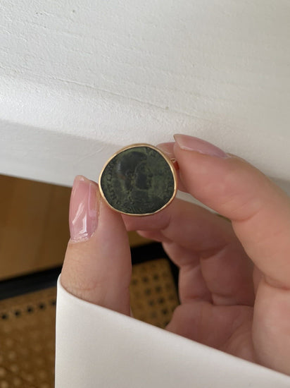18Kローズゴールドのリング(ホールマーク:フクロウ)に、アンティークのローマ銅貨をセット。