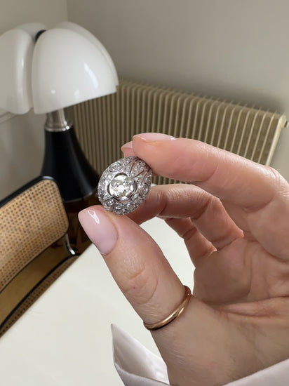 18Kホワイトゴールドとプラチナのドーム型リング(ホールマーク:ドッグヘッドとイーグルヘッド)。センターに推定約0.40カラット(カラー推定K、クラリティ推定I)のオールドカット・ダイヤモンドをセットし、その周囲に推定約0.35カラットのローズカット・ダイヤモンドをセット。