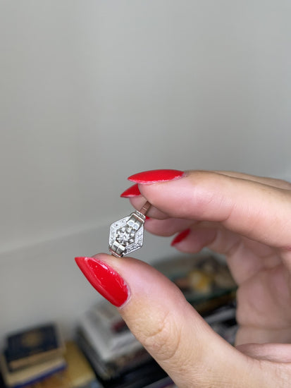 18Kホワイトゴールドとプラチナ(イーグルヘッドとドッグのホールマーク)製の六角形のアールデコ・エンゲージリングに、ローズカット・ダイヤモンドの周囲に約0.05カラットの8×8ダイヤモンドがセットされています。