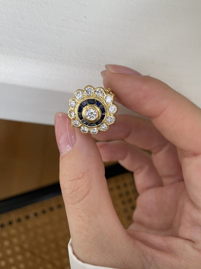 アールデコ様式のデイジー・リング、18Kイエローゴールド(ホールマーク:フクロウ)、中央にブリリアントカット・ダイヤモンド(約0.15カラット)、目盛付きサファイアとブリリアントカット・ダイヤモンド(合計約0.95カラット)をセットしたもの。