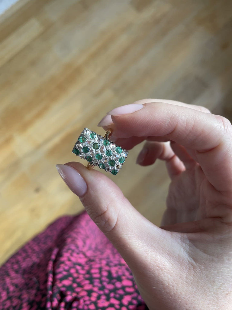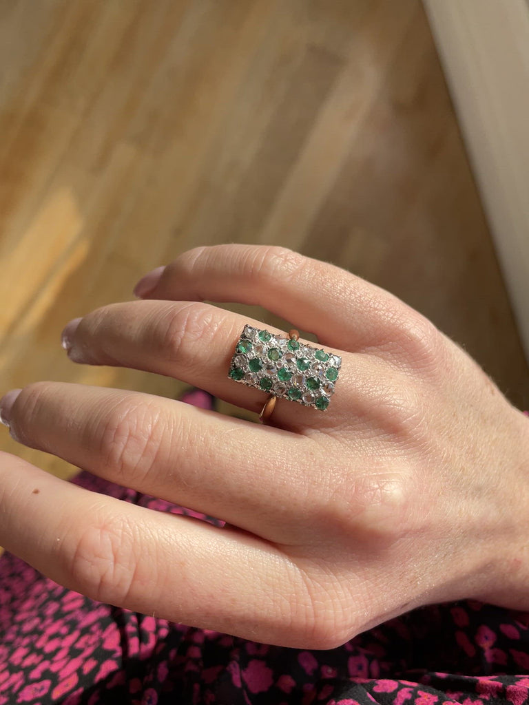 18Kイエローゴールドとプラチナ(イーグルヘッドのホールマーク)のエンゲージメントリング。中央にエメラルドとローズカットのダイヤモンドを市松模様に配置。
