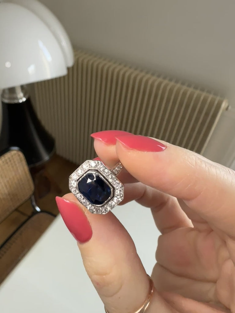 プラチナ製エンゲージメント・リング(ホールマーク:マスカロン)。センターに約1.80カラットのサファイアをセットし、オールドカットとローズカットのダイヤモンドを配している。