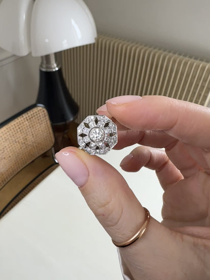 18Kホワイトゴールドとプラチナ(ホールマーク:ドッグ&イーグル)の八角形オープンワークのエンゲージメント・リング。センターに約0.30カラット(カラーは推定I、クラリティは推定SI)のオールドカット・ダイヤモンドがセットされ、その周囲に8×8カラットのダイヤモンド(総重量は推定約0.40カラット)があしらわれている。
