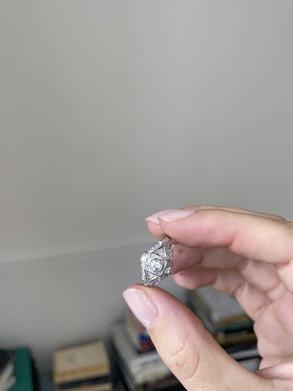 アールデコ エンゲージリング(18Kホワイトゴールド&プラチナ (ホールマーク:フクロウ、マスカロン)センターには約0.15カラットのハーフカットダイヤモンド、8×8カラットのローズカットダイヤモンド(合計約0.20カラット)がセットされています。