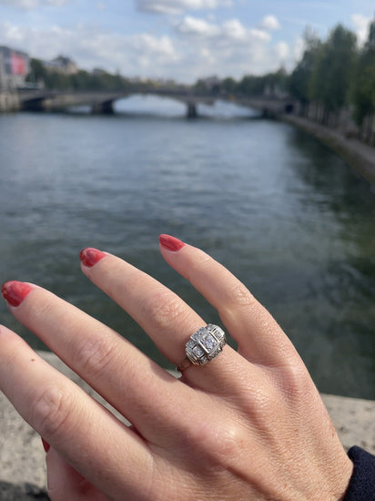 アールデコ調のプラチナと18Kホワイトゴールドのエンゲージメントリング(マスカロンとフクロウのホールマーク)中央にハーフカットダイヤモンド(約0.20ct)、8x8個のダイヤモンド(約0.40ct)がセットされています。