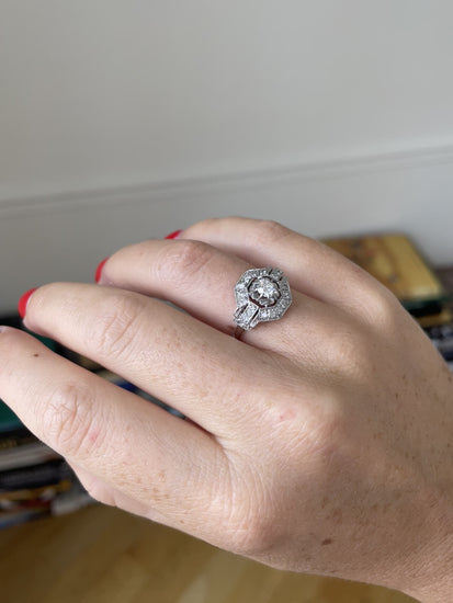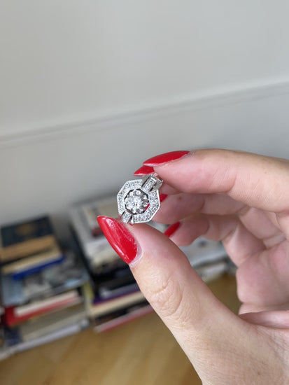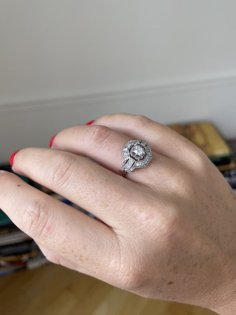 プラチナと18Kホワイトゴールド製のアールデコ・エンゲージリング(ホールマーク:イーグルヘッドとドッグ)。センターに約0.25Ct(推定カラーI、推定クラリティSI)のハーフカットダイヤモンドをセットし、8X8カットのダイヤモンド(総量約0.70Ct)をセッティング。