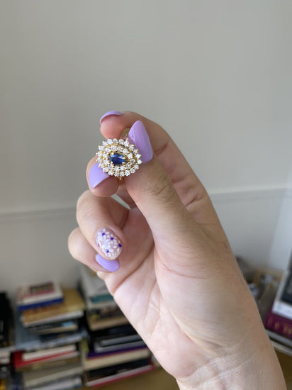18Kイエローゴールド製エンゲージリング。センターに約0.75カラットのオーバルサファイアを配し、ブリリアントカットダイヤモンドで二重に縁取りをしています。