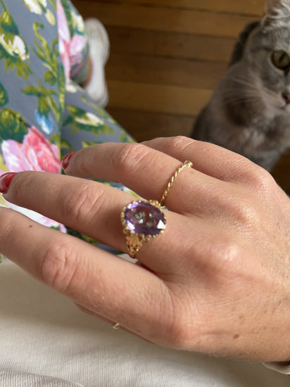 18Kイエローゴールド(ホースマーク)を使用したアンティークリング。繊細な彫刻が施されたセッティングの中央には、楕円形のアメジストに植物のモチーフが刻まれた美しいインタリオが保持されています。