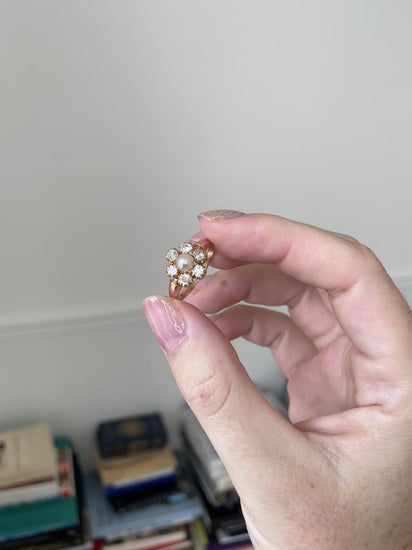アンティーク18Kローズゴールド製デイジーリング。中央にボタンパール、その周囲にアンティークカットダイヤモンド(推定約0.70カラット)。