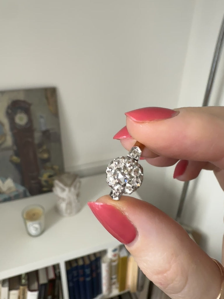 コンディション:ゴールドとプラチナ部分にごくわずかな微細な傷、いくつかの凹凸とダイヤモンドの欠損、セッティングにわずかな摩耗あり。