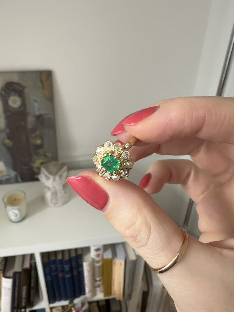 18Kイエローゴールドのデイジー・リング(ホールマーク:フクロウ)。センターにレクタンギュラーカットのエメラルド(約0.60カラット)、オールドカットのダイヤモンドをセット。