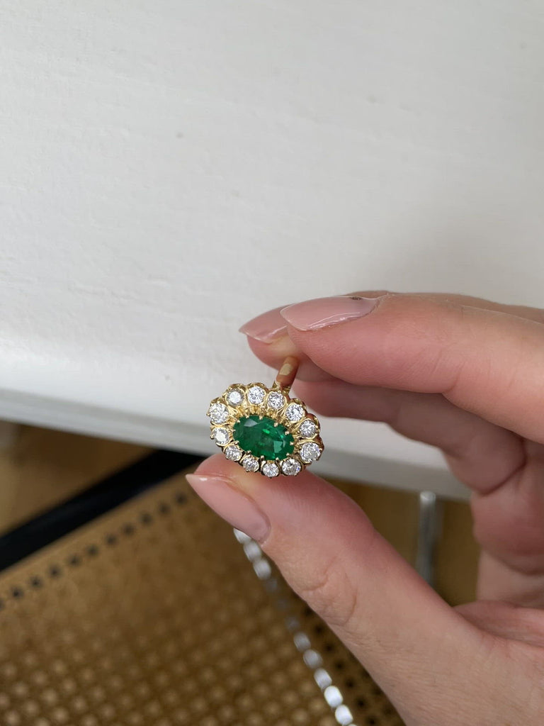 18Kイエローゴールドとピンクゴールドのヴィンテージ・エンゲージリング(イーグルヘッドのホールマーク入り)。中央に約1.20カラットのオーバル型エメラルド、ブリリアントカットダイヤモンド(推定約0.70カラット)をセット。