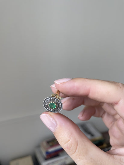 18Kイエローゴールドとシルバーのオーバルリング(ホールマーク:シャランソン)。センターに約0.25カラットの楕円形のエメラルドとローズカットダイヤモンドをセッティング。