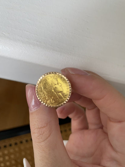 18Kイエローゴールド(イーグルヘッドホールマーク)のヴィンテージ・リングに、マリアンヌを象った10フランの金貨をセットしたもの。