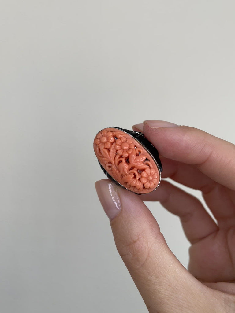 18Kホワイトゴールドとプラチナのカクテルリング(ホールマーク:フクロウとマスカロン)、中央に楕円形の珊瑚のモチーフが花で彫られている。