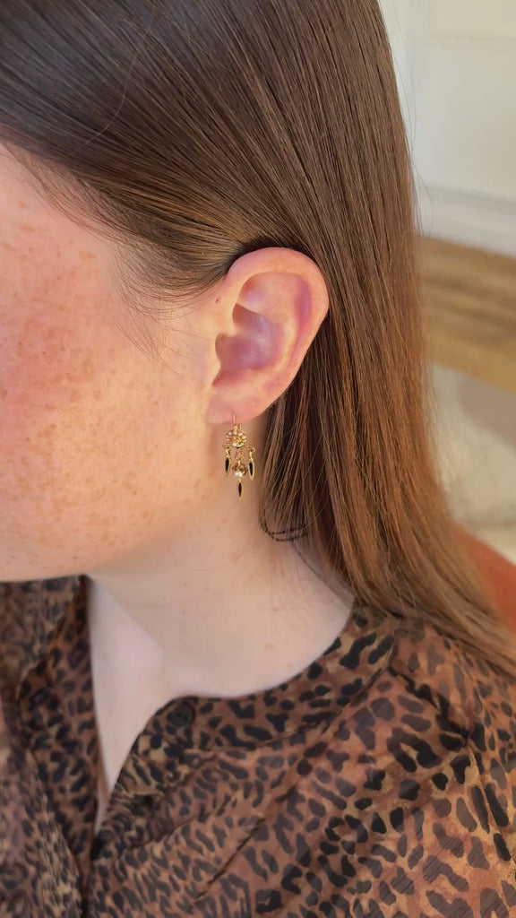 18Kイエローゴールド(ホースヘッド・ホールマーク)のスリーパー・ピアスに小粒パール(おそらく上質)とブラック・エナメルをセット。