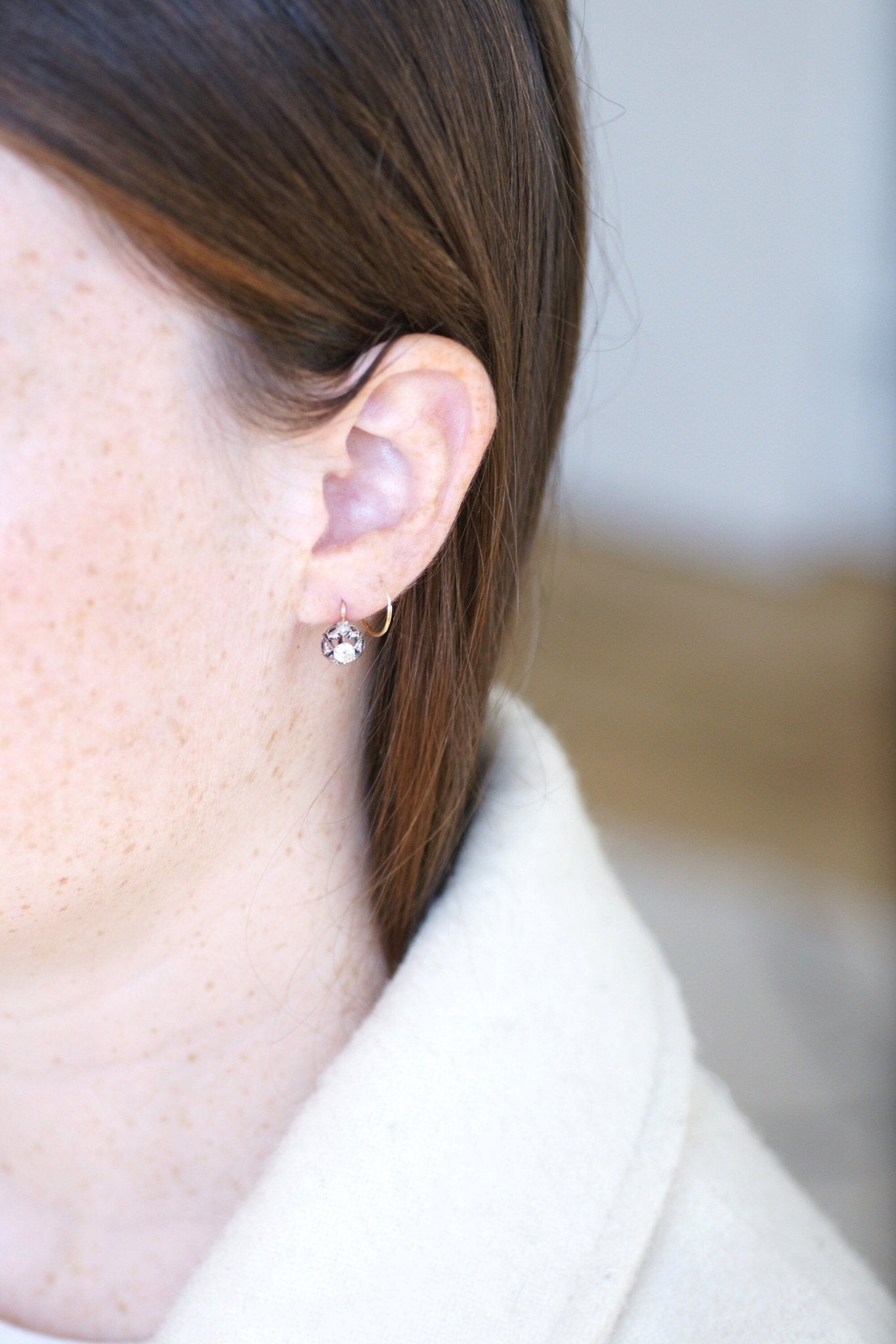 18Kローズゴールドとプラチナ(ホールマーク:馬の頭)製のスリーパー・ピアス。2石のオールドカット・ダイヤモンド(推定重さ約0.55カラット、推定カラーHとJ、推定クラリティVS)がセットされ、2石の小さなローズカット・ダイヤモンドがセットされている。