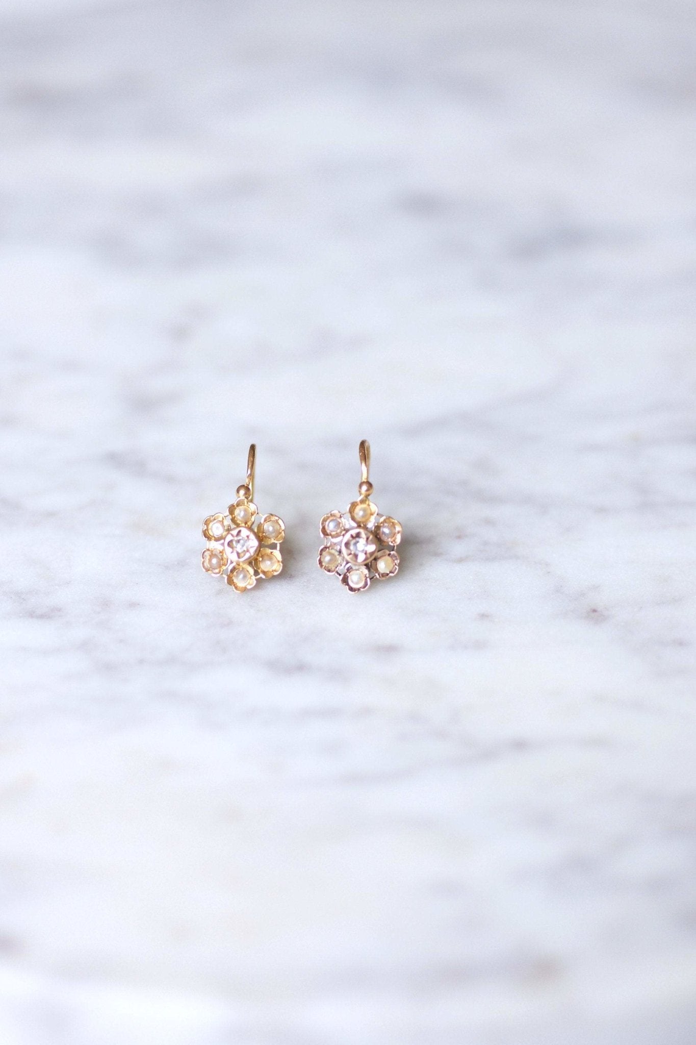 18Kローズゴールド(ホースヘッド・ホールマーク)の花形スリーパー・イヤリングには、小さなパールと中央にローズカット・ダイヤモンドがあしらわれています。