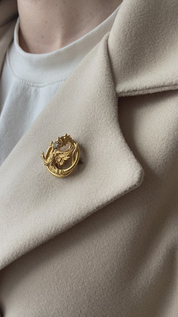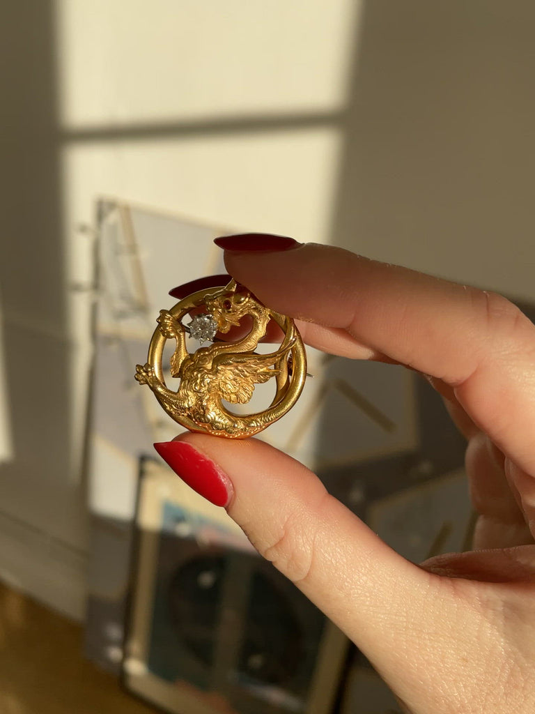 18Kイエローゴールドとプラチナのブローチ(ホールマーク:フクロウとマスカロン) 細かく彫られたキメラが装飾され、口には約0.25カラットのオールドカットダイヤモンド、目には赤い石(ガラス)を持っています。