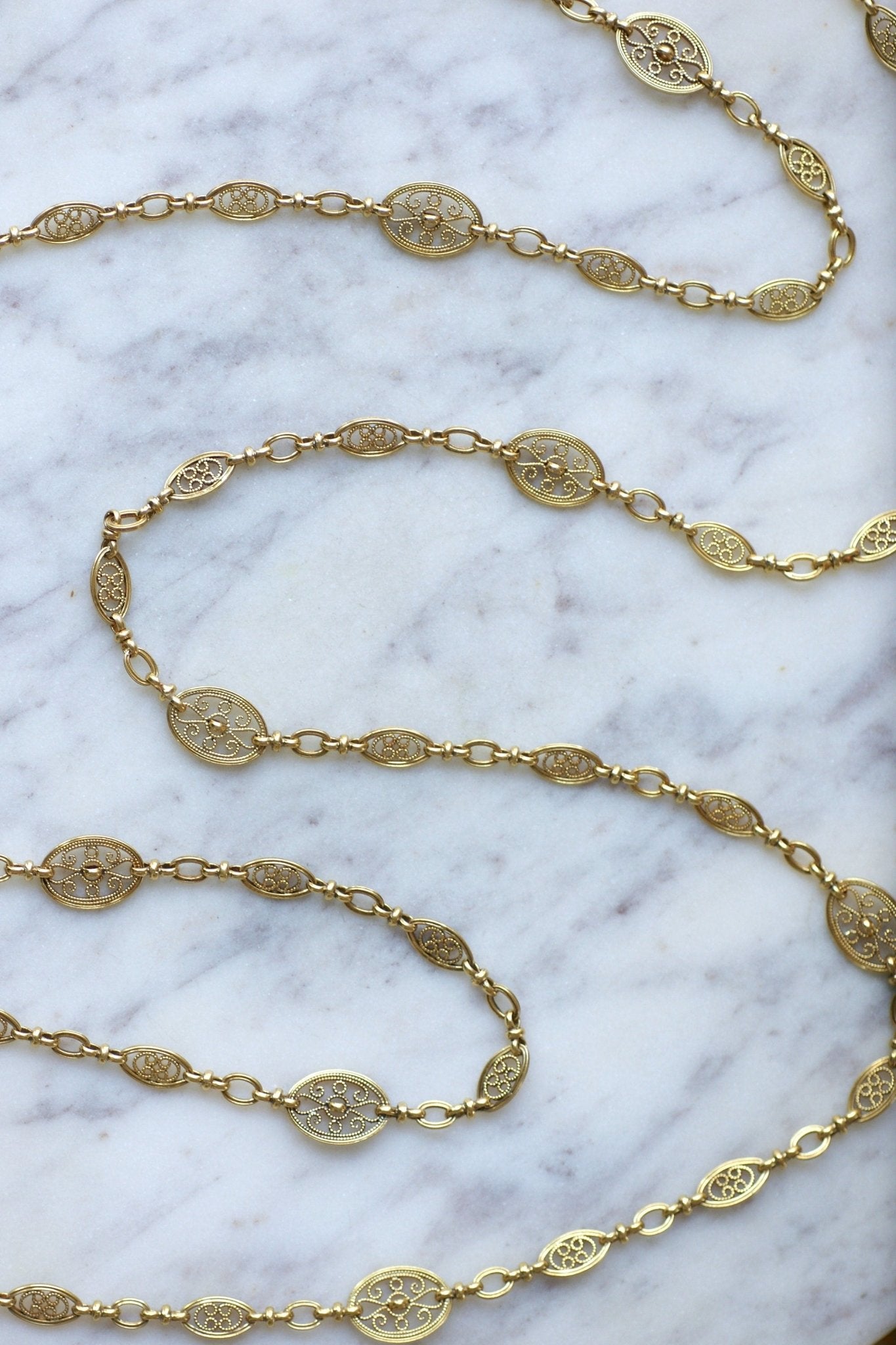 ネックレス、アンティークゴールドチェーン155cmオーバルフィリグリー