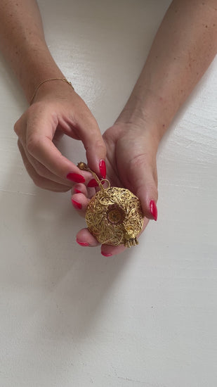 希少な18Kイエローゴールドのパース(ホールマーク:雄羊の頭、ハンガーにフクロウ)全体に葉と花のモチーフのチェーシングが施されています。