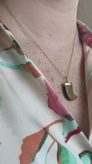 18Kイエローゴールドのアミュレットペンダント。タイガーアイが爪の形に彫られている。