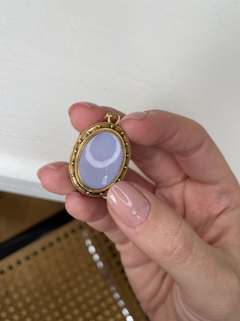 18Kイエローゴールド(イーグルヘッドホールマーク)製オーバル型フォトロケット・ペンダント、2枚のメノウ製プレート付き。