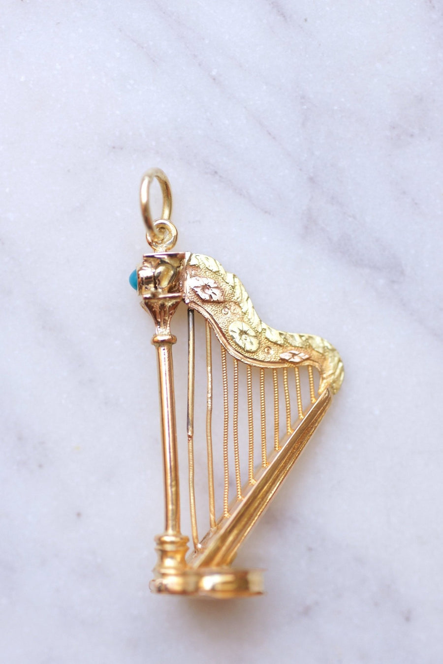 アンティークの18Kイエローゴールドのハープペンダント。小さなターコイズの石が付いており、台座には秘密のコンパートメントが付いています。